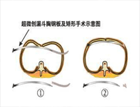 在 胸腔镜导引下手术植入量身塑造的金属板,将胸骨凹陷往外推出来,做矫正手术。所有向内凹陷变形的肋软骨也用金属板向外推出,但是没有任何肋骨被切除,也没 有胸大肌切开。最近几年开展的微创手术为Nuss方法。该手术创伤轻,术后恢复快,术后下床活动早,手术后并发症少,畸形矫正效果满意率高,复发率低,对 成年人也获得了良好的效果。漏斗胸术后的康复是值得关注的问题,患者应积极坚持术后的康复训练,尤其是成年人这点十分重要。
