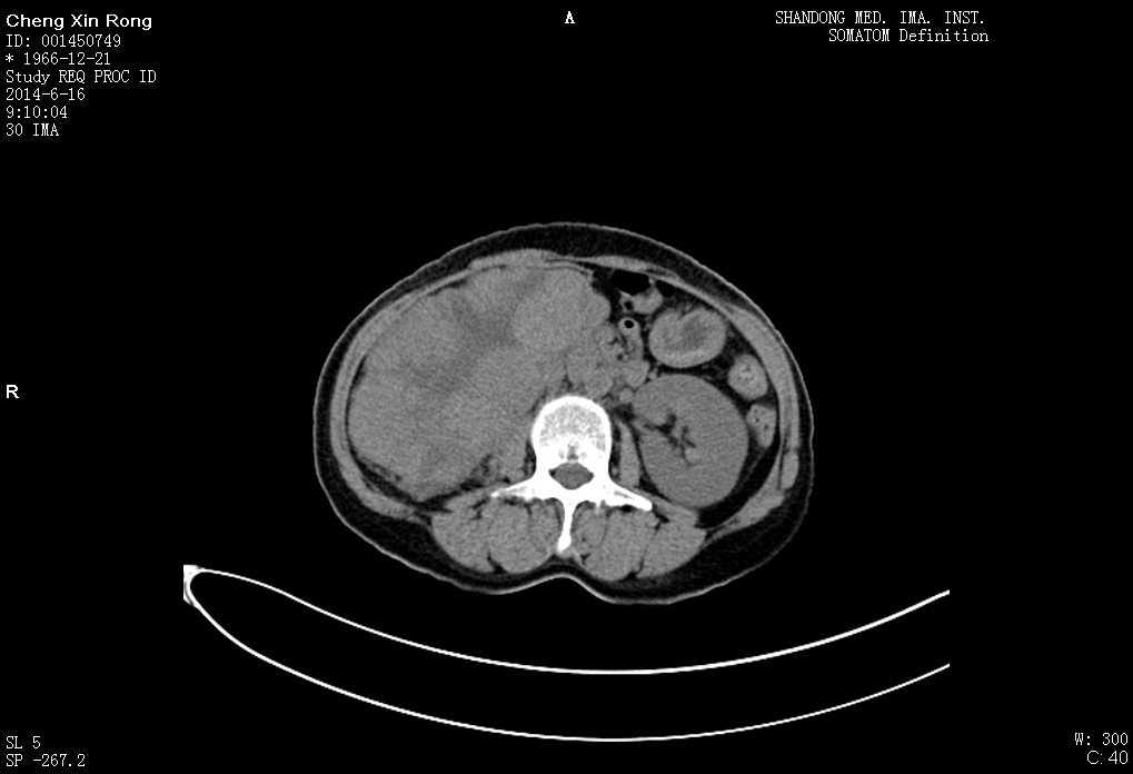 该患者4个月前无明显诱因开始出现发热并右侧腰痛,就诊于当地医院,该医院行MRI检查后认为瘤体巨大,手术风险极高,遂建议其求诊上级医院。我院泌尿外科毕东滨副主任医师接诊该患者后以“右肾占位”收住院。患者入院后行CT检查提示:右肾巨大包块,与下腔静脉关系密切,将下腔静脉推挤向左方。肾静脉被压迫明显,管径被挤压,肿瘤上极与肝脏关系不明。全科组织病案讨论,集思广益,对于手术慎之又慎,反复研究病情,各科室密切协同,精心进行术前准备,并与患者充分沟通交代病情及明确手术方案及风险。在院内肝胆外科、麻醉科、血管外科等专家积极参与下,最终确定了治疗方案。毕东滨主任在术前指出:虽然手术风险大,手术难度高,但是作为一名省医人,要排除万难,发扬革命的救死扶伤精神,尽全力进行救治。
