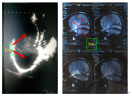 2015年11月19日下午我见到了这个让青海省各大医院专家疑惑不解的小患者——一个活泼可爱的小姑娘。和小姑娘父母交谈得知,小患者活动时呼吸憋喘1年半,休息时无症状,在青海省人民医院、青海大学附属医院及青海红十字医院就诊,无法明确诊断。查体:生命体征平稳,颈静脉充盈正常,无怒张,右肺呼吸音略粗,无干湿性啰音,心脏浊音界向两侧扩大,右侧更著。各瓣膜听诊区无杂音。肝脏触诊软,无肿大。腹部无压痛。2014年8月12日,青海省人民医院心脏超声:右房左右径57mm,右室前后径32mm,明显增大,左房室内径正常,房室间隔连续完整,各瓣膜启闭正常,三尖瓣附着点下移,右心房自显影。结论:三尖瓣发育异常,考虑三尖瓣下移畸形,右心内自显影。2014年8月13日,青海大学附属医院超声同样显示右房室增大,但发现了房水平细小左向右分流束1.5mm,未探及明显三尖瓣前叶回声。结论:三尖瓣发育畸形,卵圆孔未闭。2015年11月12日,青海省红十字医院超声:右房68X119mm,明显增大,右房侧壁瘤样扩张,其上多处破口有血流与右房交通。右房内探及37X55mm偏强回声团块。结论:右房增大,考虑右房房壁瘤,右房血栓。代表青海省最高水平的三家医院结论不一,诊断相差很大。但其中一个共性是右房增大。我认真思考,仔细鉴别,引起右房增大的疾病包括房缺、肺动脉畸形引流、三尖瓣狭窄或返流、肺动脉高压等。