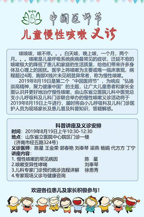 2019年8月19日是第二个“中国医师节”,为响应“弘扬崇高精神,聚力健康中国”的主题,让广大儿童患者和家长全面认识并更好地治疗慢性咳嗽,由山东省立医院儿科中医党总支小儿呼吸科及儿科门诊联合举办的慢性咳嗽义诊活动将于2019年8月19日上午进行,届时将由小儿呼吸科及儿科门诊医护人员为现场家长及患儿普及科普知识,答疑解惑。