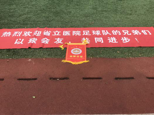 泰医附院足球队的同仁们对省医足球队的到来表示了热烈欢迎,双方球员进行了愉快的交流,赛前我院队长范文嘉和泰医队长陈冉交换了队旗并合影留念。