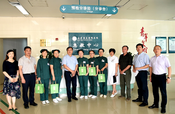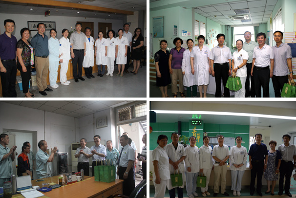 7月19日—31日,院领导班子成员分头带领各职能处室负责人,各总支书记等分成11组,分头亲切慰问了中心院区保健系统、外科系统、妇产五官系统、儿科中医系统、医技系统、总务系统、内科系统、机关系统、儿童医院工地,以及东院保健呼吸内科、急救中心、心外科等27个科室的职工,为大家发放降温茶。19日下午,院长秦成勇带队走访了中心院区保健系统,党委书记王一兵走访了东院保健呼吸内科、妇科、儿内科等。院领导所到之处与员工们亲切握手并给予诚挚的问候:“你们辛苦啦!感谢大家!”,当大家双手接过院领导们手中的降温茶时,一声声发自内心的“谢谢领导”,一张张朴实真诚的笑脸,表达出了最质朴纯粹的感情。慰问中,院领导一边与职工亲切交谈,了解职工的工作、生活情况,一边详细了解各病区运转情况。秦院长特别叮嘱大家:天气炎热,大家工作量大,要抓好医疗质量、护理质量、服务质量、安全管理等工作的同时,还要照顾好各自的身体,希望广大员工注意劳逸结合,度过一个安全、健康、清凉的夏季。