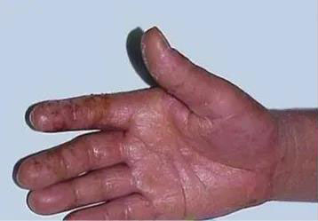 4、汗疱疹:又称为出汗不良性湿疹,表现为对称性发生于手和(或)足的大量小水疱,水疱位于表皮深层,略高出皮肤表面,可伴有瘙痒、刺痛或烧灼感。