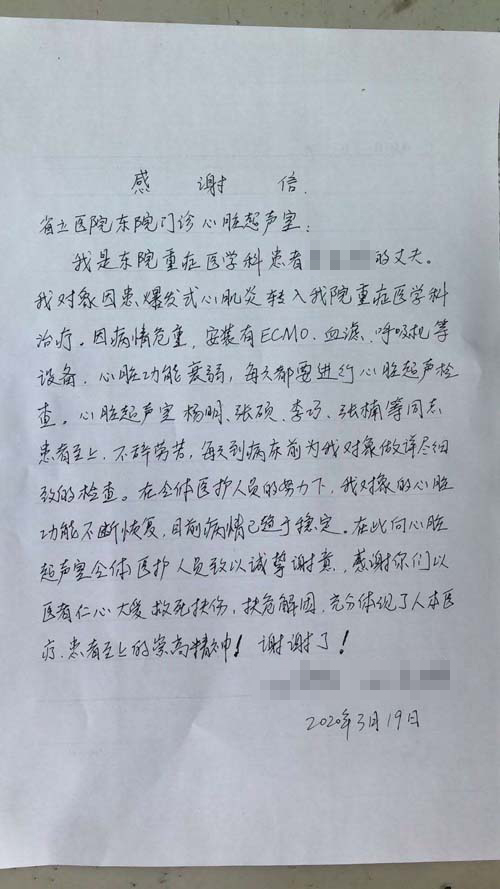 近日,超声诊疗科东院门诊心脏超声室医护人员收到了一封来自患者家属的感谢信,信中表达了对该科杨明、张烁、郭振伟、李巧、王慧慧、张楠等多名医护人员的感激之情。