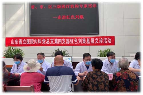 5月26日早上6点,第四支部的党员志愿者们乘车出发前往东营,与十二支部及东营市人民医院、河口区人民医院共计50余名党员专家走进了广饶刘集红色教育基地开展联合义诊。此次义诊共涵盖消化内科、重症医学科、乳腺甲状腺外科、血液内科、风湿免疫科、肛肠科、呼吸内科等多个科室,全面保障了广大居民对常见病的咨询诊治需求。