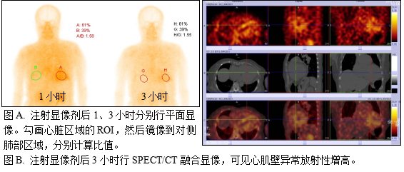 本例患者因“发作性胸闷、憋喘、气短6年,加重14天”入院,既往心律失常、心房颤动病史6年。结合病史及相关辅助检查,临床虑ATTR-CA可能。无创的核医学显像在ATTR-CA的诊断中具有较高的敏感性和特异性。核医学科夏志明医师在心内科李敏副主任医师、孙永乐副主任医师的指导下开展文献调研,结合国内核医学显像剂获批情况,确定选用99mTc 标记焦磷酸盐(99mTc-PYP)进行ATTR显像。99mTc-PYP最初用于急性心肌梗死病灶显像以及骨显像,但目前已基本停用。核医学科姚树展主任、吕宽副主任积极多方联系订购显像剂,完善显像方案。