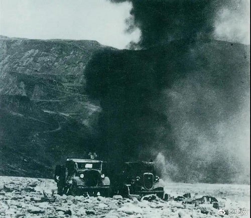 1937年10月18日,八路军第一二〇师一部在山西雁门关以南伏击日军,毙伤敌300余人,击毁敌汽车20余辆。图为燃烧着的日军汽车。