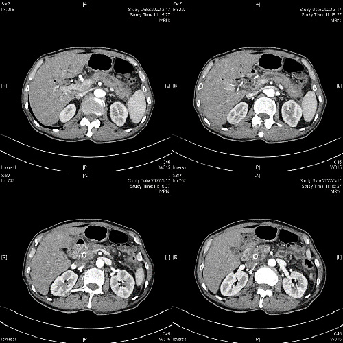 患者摆好手术体位后,胡锦华主任医师及科室医护人员在崔屹主任医师指导下,在超声内镜下精准穿刺主胰管,造影证实主胰管明显扩张(约5mm),导丝反复探查并越过胰头部病变经十二指肠乳头进入肠道。更换十二指肠镜后捕获导丝并由活检通道取出,再按经典ERCP操作,扩张狭窄段,置入支架,手术顺利完成。术后第2天,老孙自觉疼痛缓解,胰腺淀粉酶指标降至正常。