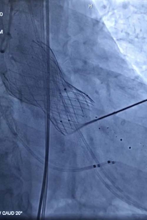 患者为67岁老年女性,因活动后胸闷憋气于2022年1月至我院东院区心内科门诊就诊。患者行心脏彩超提示主动脉瓣重度狭窄,冠脉造影提示冠脉三支病变,需到心外科行冠脉搭桥+主动脉瓣置换手术。但患者家属提供的病史提示患者20余年前因车祸致右侧肢体活动不灵、进食呛咳、言语欠清等后遗症,麻醉手术科评估后认为患者若行全身麻醉及体外循环,则术后有脑梗塞加重、肢体活动不灵及呛咳加重风险,严重时会导致无法拔除气管插管甚至误吸风险。东院区心内科副主任王勇全面评估患者各项生命体征及检查结果后,建议患者行局麻下极简式经导管主动脉瓣置换术,患者家属同意此手术建议。