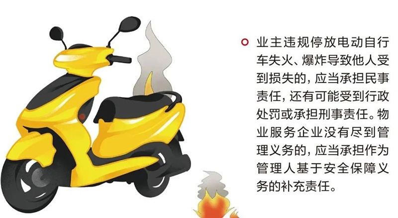 其次是行政处罚。《高层民用建筑消防安全管理规定》第三十七条明确:“禁止在高层民用建筑公共门厅、疏散走道、楼梯间、安全出口停放电动自行车或者为电动自行车充电。”