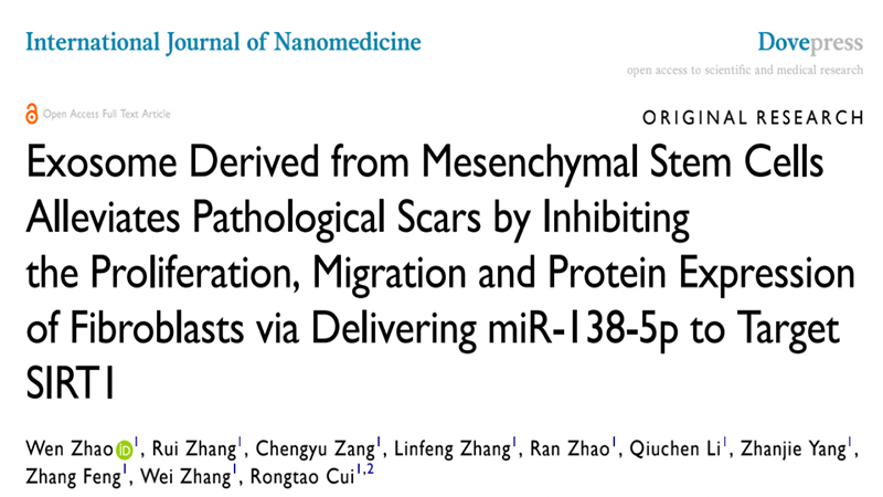 近期,伟德1949官方网站(山东省立医院)烧伤整形美容外科崔荣涛副主任医师团队在国际著名期刊《International Journal of Nanomedicine》发表了题为“Exosome Derived from Mesenchymal Stem Cells Alleviates Pathological Scars by Inhibiting the Proliferation, Migration and Protein Expression of Fibroblasts via Delivering miR-138-5p to Target SIRT1”的研究论文。该研究通过一系列设计精巧的体外细胞实验详细阐述了病理性瘢痕新的发生机制,其研究成果可为病理性瘢痕发病机理研究提供方向性指导,为制定有效预防和治疗措施提供理论依据。
