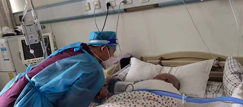 老人住院期间,医护人员每天严密监测老人的病情,关注老人各项生命体征及血氧饱和度的变化,进行营养支持、维持水电解质平衡等对症治疗,同时指导老人规律服药,并及时关注胃肠道及其他不良反应。按照《老年型冠状病毒肺炎诊治与防控专家共识》的推荐意见,医护人员指导老人每日俯卧位治疗。1月10日,老人顺利脱离高流量氧气吸入,在鼻导管吸氧状态下,血氧饱和度在95%以上,且憋喘症状较前明显缓解。