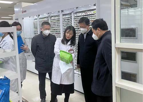 王玉强副局长一行先后查看了东院西药房、中药房,针对药房功能定位、面积、工作量、人员配比、工作流程及药品配备、分区摆放、批号及效期管理、日常养护等药品质量管理相关工作展开调研。