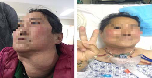 患者为60岁女性,20余年前曾行结节性甲状腺肿切除,随后出现结节性毒性甲状腺肿,同时患有房颤、心衰、乳腺癌等多种疾病。近一年来,患者甲状腺增生明显,严重压迫颈段气管,最狭窄处直径仅为4mm,继发呼吸困难、心衰,一度病危。患者多方求医,但因其病情复杂、手术难度、风险巨大,多所三甲医院均表示无法手术。患者辗转找到我院耳鼻咽喉头颈外科许风雷、夏明手术团队。两位医生组织包括内分泌科、麻醉科、心外科、重症医学科等学科的MDT,针对患者无法插管、心肺功能差的复杂病情,制定了手术方案:先期由内分泌科主任医师李茵茵为患者治疗,控制患者甲亢,改善心肺功能,术中ECMO技术支持,完整切除巨大甲状腺肿。