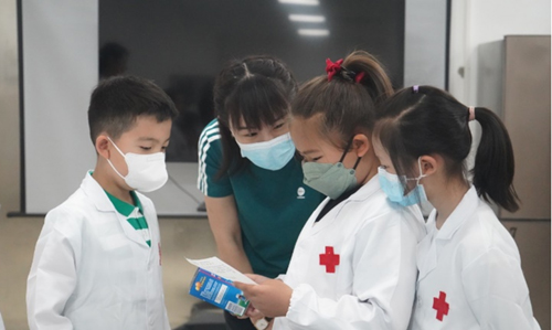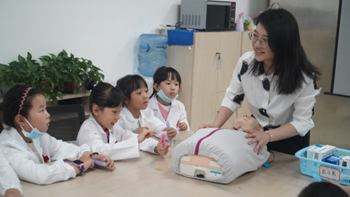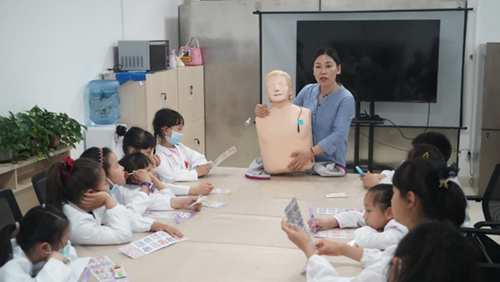 临床药师唐琳、邹东娜带领小朋友们进行情景模拟,使用技能培训模拟人体验心肺复苏、海姆立克急救的实际操作,了解适宜的急救知识。
