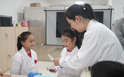 药师米兰、陈冉分别扮演药师和患者,模拟发放药品、用药交代的过程,指导孩子们参与体验。孩子们一板一眼地模仿着药师们工作的样子,从刷卡、发药,再到用药交代,做得认认真真、有模有样。