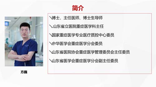 科室带头人方巍从事危重病人救治工作十余年,经验丰富,临床水平高,医德高尚,屡获表彰。作为山东省医疗队员参加了多次重大医疗救治任务;作为学术带头人,积极推动重症超声在山东省的应用,连续四年举办重症超声培训班,培训人员300余人;作为山东援鄂医疗队重症专家组组长支援武汉,作为国家专家组成员奔赴内蒙古参加新冠救治,荣获“全国卫生健康系统新冠疫情防控工作先进个人”。获评济南市高层次领军人才。每年专科教学查房100余次,每年参加三级医院间重大会诊超30次。发表SCI文章十余篇,承担国家级研究课题1项,省级课题1项,市级课题1项,发明专利2项,主编著作1部,翻译著作2部。