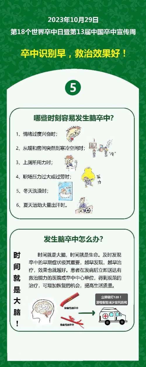 2023年10月29日是第18个“世界卒中日”。今年世界卒中组织提出的世界卒中日主题是:“Together we are #Greater Than Stroke”,国内中华医学会神经内科分会脑血管病学组翻译成:“一起行动,战胜卒中”,中国卒中学会提出宣传主题和口号:卒中,重在预防。国家卫健委百万减残工程委员会宣传口号:卒中识别早,救治效果好。