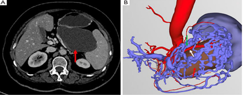 (A) 术前CT显示胰体尾部囊性病变(红色箭头),与脾血管毗邻关系密切;