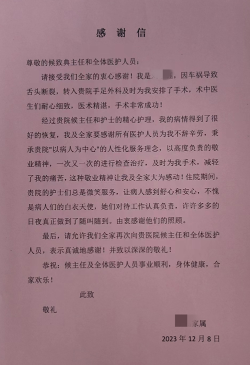 术后,患者被送回病房进行观察和护理。患者无法经口进食,护士们就通过中心静脉置管进行胃肠外营养。患者病情稳定后,护士们又通过插上的胃管,进行肠内营养,以促进胃肠功能恢复。医护团队对患者的病情进行了密切的观察和记录,及时处理各种并发症,还对患者进行了心理疏导和安慰,帮助他度过艰难的术后的恢复期。在医护团队的精心护理下,患者的病情逐渐稳定下来,12月上旬,患者康复出院,出院前患者及家属送来了感谢信和锦旗,以表达其对医护团队夜以继日无微不至的照护的无限感激之情。