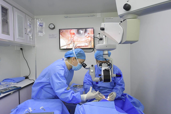 仪式结束后,与会嘉宾来到“复明4号”流动眼科手术车前,看望已于17日接受复明手术的患者。张晗教授一一为患者揭开纱布,检查术后恢复情况。仪式结束后,张晗教授及其团队继续为未进行复明手术的白内障患者进行了手术。