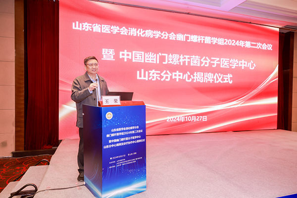 王荣副院长在致辞中指出,幽门螺杆菌是胃癌的主要致病因素,根除幽门螺杆菌能够有效预防胃癌,通过筛查和个性化治疗,努力将山东的Hp感染率逐年降低具有良好的社会意义。山东分中心的成立,使消化医生能够借助国家中心的先进检测技术,开展个性化诊疗,不断提高Hp根除成功率,造福山东群众。