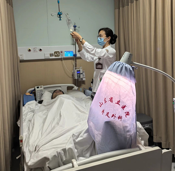 1月29日,手足与显微重建外科医师团队为紧急入院患者进行手术,中心院区、奥体院区医护人员精心照护患者,助力患者康复。