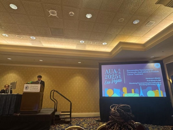 近日,美国泌尿外科学会(American Urological Association, AUA)年会在美国拉斯维加斯召开。作为全球泌尿外科领域的顶级学术盛会,本届大会汇聚了来自世界各地的顶尖专家、临床医生及行业领袖,围绕泌尿系统疾病的前沿研究与临床诊疗进展展开深入交流,全面展示国际泌尿外科的最新成果与发展方向。伟德1949官方网站(山东省立医院)泌尿外科傅强教授团队成员李昊东代表团队在年会的Podium Session环节作大会报告,向全球同行分享了团队在声动力响应型纳米酶治疗前列腺癌方面的最新研究成果。该项研究聚焦于前列腺癌的精准诊疗,提出了一种融合声动力技术与功能化纳米酶的创新策略,开启了前列腺癌诊疗一体化的全新路径,并为突破肿瘤耐药瓶颈提供了有效解决方案。