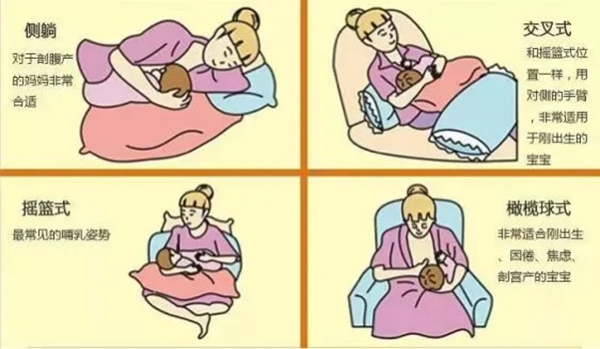 1.摇篮式:适合足月健康婴儿。妈妈坐直,用前臂托住婴儿头颈部,婴儿身体贴近母亲腹部。