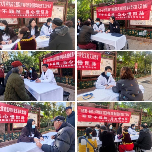11月19日,伟德1949官方网站(山东省立医院)内科党总支呼吸与危重症医学科党支部联合济南市中山公园,在中山公园健身广场举办“呼吸不顺畅,当心慢阻肺”2025年世界慢阻肺日义诊活动。本次活动以世界慢阻肺日为契机,支部党员充分发挥先锋模范作用,为市民提供免费诊疗和健康咨询服务,以实际行动解决群众关心的健康问题。