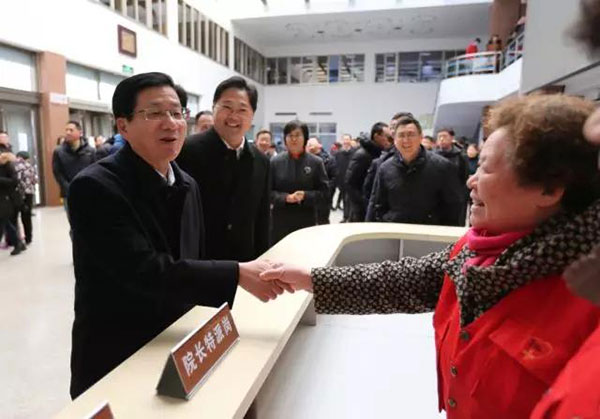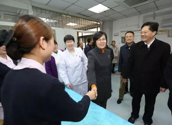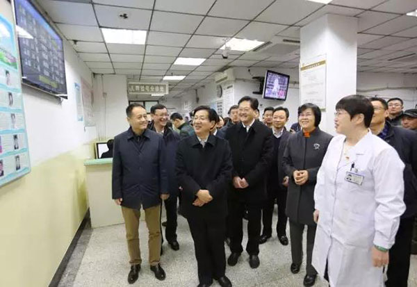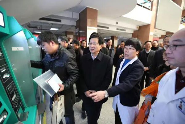 孙继业副省长一行首先来到门诊大厅,他仔细询问自助挂号机如何方便患者就诊。听说患者可以通过一台小小的机器实现办卡、挂号、缴费等多项功能,孙省长连连称好。孙省长随后视察了门诊大厅院长特派岗和学雷锋服务岗,与在岗的工作人员亲切握手,并向他们致以节日的问候。