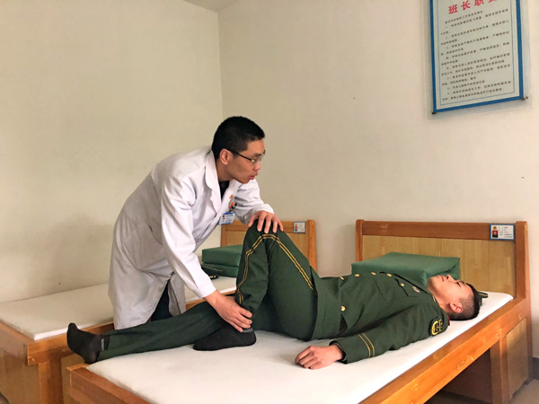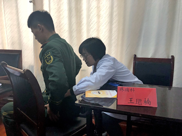 由于特殊的地理位置和工作性质,战士们的关节大部分都有不同程度的磨损,推拿科的王强主任、骨关节科的袁林主任,一一对战士们的受伤部位进行了简单的修复和调理,并悉心指导他们平时应该如何锻炼核心肌体,增加耐力,如何通过简单的活动调整和稳固自己的关节。